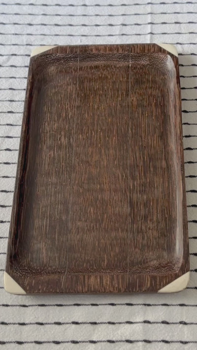 Bandeja esculpida em estipe de palmeira com detalhes em osso bovino nas quatro pontas.