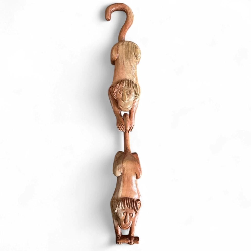 Macacos esculpidos em madeira pela família Julião. Dica: Eles podem ser pendurados uns aos outros formando uma corrente ou usados como pendurador de objetos, porta toalha, etc.
